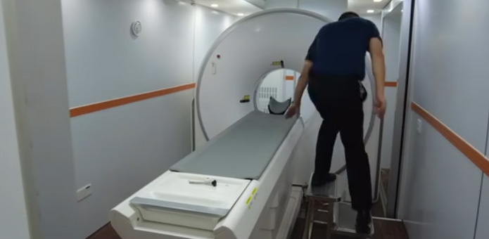 移動CT體檢車開機檢查階段,打開空調(diào)外機艙門,確保正常散熱,打開車里面的所有燈。然后打開空調(diào),調(diào)到制冷模式,把溫度調(diào)到20度左右。然后按車控電源開關(guān),然后打開儲能輸出開關(guān),打開滑移艙。長按伸縮按鍵,待滑移艙完全打開就可以了。固定滑移艙踏板,不要超過邊緣處。放下固定插梢,勾住背面的拉環(huán),輕輕的往下放,松開CT檢查床固定裝置。檢查床為可正常推動狀態(tài)。擺放輔助樓梯,打開機架開關(guān),機架開關(guān)在CT左側(cè)處,啟動架子開關(guān)后設(shè)備電腦將自動開啟。輸入電腦賬號密碼登陸,關(guān)閉防護門警示燈工作狀態(tài)。調(diào)整檢查床位置,通過操控臺移動檢查床。進行球管預(yù)熱階段,選擇日常維護狀態(tài)。點擊球管根據(jù)界面提示完成球管預(yù)熱,進行空氣校準階段,根據(jù)界面提示完成空氣校準。進入掃描階段,錄入受檢人員信息,并且確認受檢部位。引導(dǎo)受檢人躺下檢查,待躺好后,調(diào)整檢查床。定位好后歸零。通過遙控臺發(fā)出指令,選擇定位。完成拍片工作,